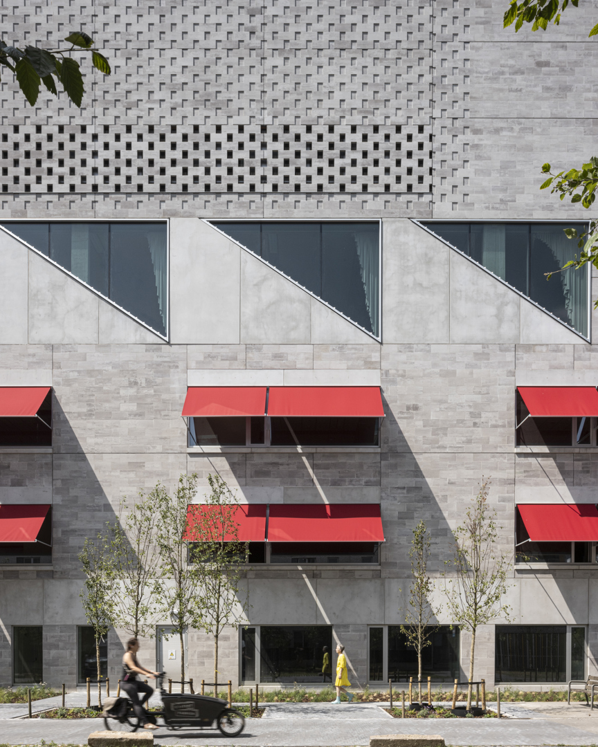 Rondom kreeg KUUB een open en levendige plint, met doorzichten naar leslokalen, ateliers, bureauruimten, refter en atrium. Die transparantie versterkt de relatie tussen gebouw en buurt en maakt de dagelijkse werking zichtbaar in het straatbeeld. De plint fungeert als overgangszone tussen school en stad, waar binnen en buiten visueel in elkaar overlopen. Architectuur en gebruik vallen hier nadrukkelijk samen.