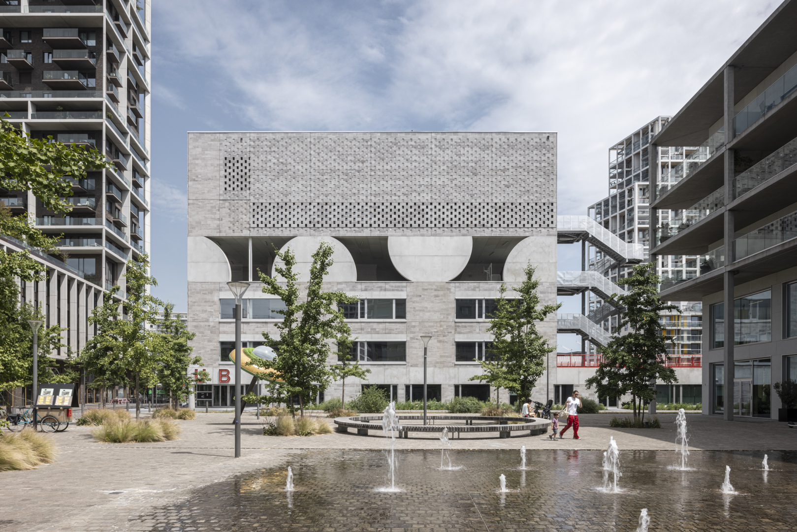 Ook de speelruimtes maken deel uit van de ruimtelijke compositie. Aan de zuidzijde ontvouwt zich een cascade van speelpleinen, van een robuuste overdekte speelplaats op niveau drie tot meer groene en beschutte zones op het maaiveld. Die gelaagdheid creëert zowel ruimtelijke openheid als differentiatie in gebruik, afgestemd op leeftijd en activiteit.
