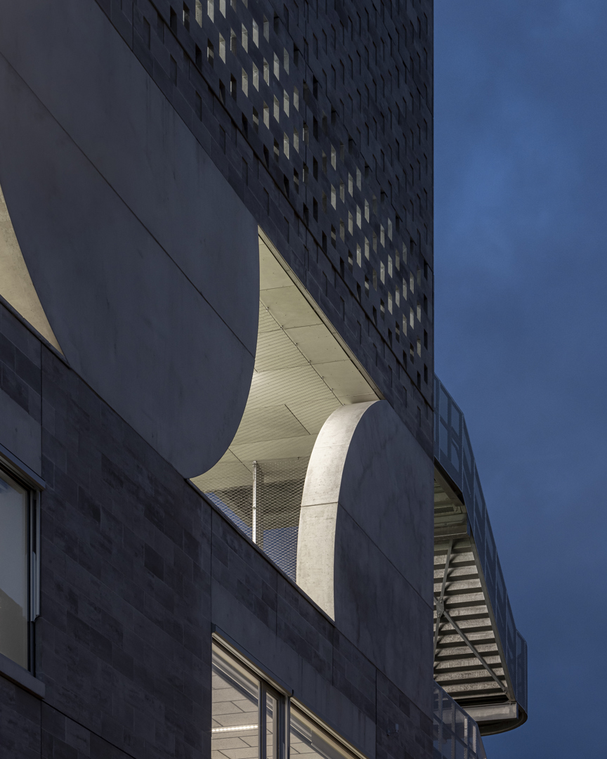Het ontwerp van Compagnie O vertrekt van het concept van een hybride gebouw, waarbij de verschillende programma’s niet letterlijk leesbaar zijn aan de buitenzijde. De samenhang ontstaat vooral binnenin, rond een vier verdiepingen hoog atrium dat fungeert als centrale circulatieruimte en ontmoetingsplek. Dit atrium vormt de ruimtelijke ruggengraat van het volledige complex.