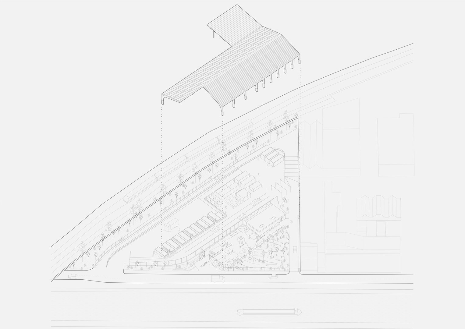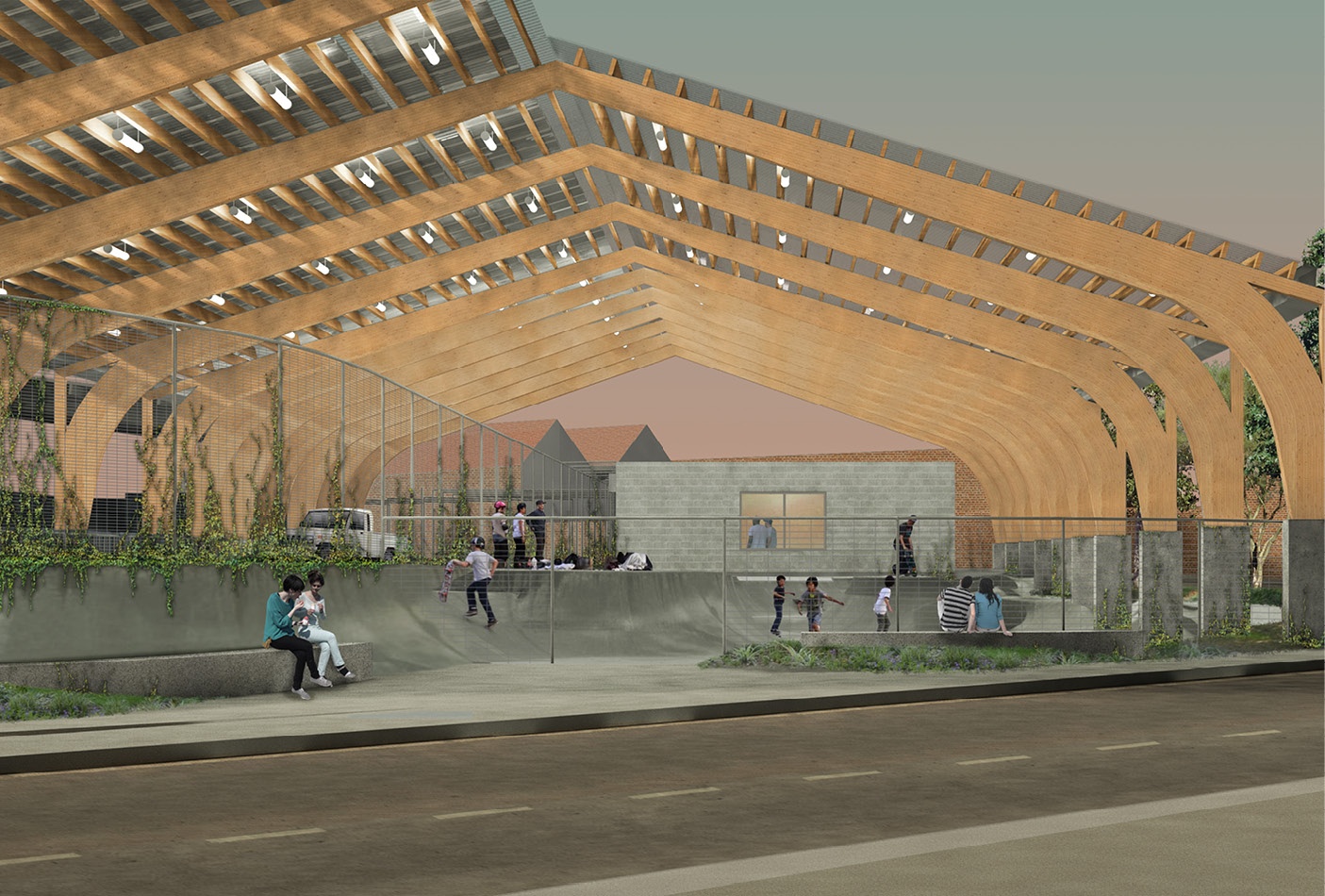 Het containerpark en een groot deel van het skatepark en het groen worden overdekt door een luifel. Hoewel het publieke gedeelte en het containerpark apart beveiligd zijn, zorgt de daarmee gecreëerde hal voor een gedeeld beeld die de plek ook laat inpassen in de schaal van de omringende industriële gebouwen.
