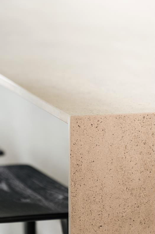 Beide ruimtes zullen opgelicht worden door Keon uit de Dekton® Tech-collection. Een grijzige uitvoering met bruine accenten die afhankelijk van het interieur waarin het komt erg minimalistisch of net heel warm kan zijn. Sofie combineert haar Keon-werkblad met keukenkasten in een uitnodigende houten uitvoering om de natuurlijkheid van het blad in de verf te zetten en zo de rust te laten overheersen.