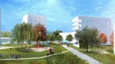 De spoorweg zal verdwijnen achter 3 park-torens die de westelijke rand vormen van het park