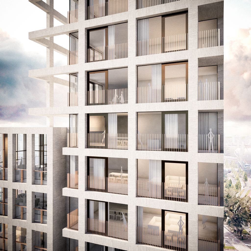 Het ontwerp van de woontoren (70-110 m) is opgevat als een elegant stedelijk figuur waarbij eenheid en verscheidenheid subtiel gebalanceerd zijn. Elk volume is voorzien van een specifieke kroon die fungeert als lantaarn en herkenningspunt in de omgeving. Een witte bakstenen toren drukt helderheid, hardnekkigheid en een strakke organisatie uit.