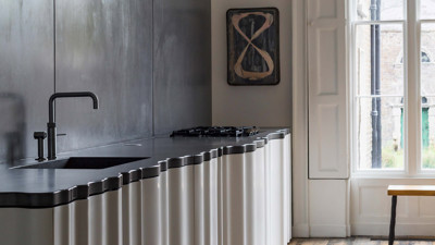 Ook de keuken oogt atypisch dankzij zijn golvende vorm. Die werd verkregen door verhitte Corian te persen en het gebruik van beton. Dat kronkelende oppervlak absorbeert en verspreidt licht. Op het eerste zicht lijkt er weinig aanwezig te zijn in de kamer. Dat komt doordat de apparatuur zoals de koelkast, zich verschuilt achter de witte kast.