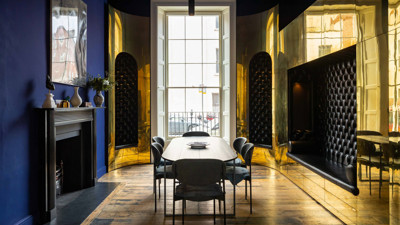 In het D2 Townhouse speelt contrast de hoofdrol. De flamboyante elementen steken af tegen de ingetogen details. Neem nu de leefruimte. Die is omringd door een glanzend, architectonisch meubel gemaakt van messing. De gouden tint komt goed tot zijn recht dankzij de sobere donkerblauwe muren. Het doel hiervan is meer ruimtegevoel creëren.