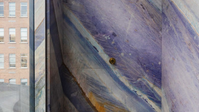 Verder is de woning voorzien van meerdere badkamers. In het exemplaar onder de trap installeerde Moulson onyx panelen om een soort van “bubbeleffect” te creëren. In een andere sanitaire ruimte op de bovenverdieping gaan de roze fluorescerende bekleding en het witte oppervlak rondom de wastafel met elkaar in dialoog.