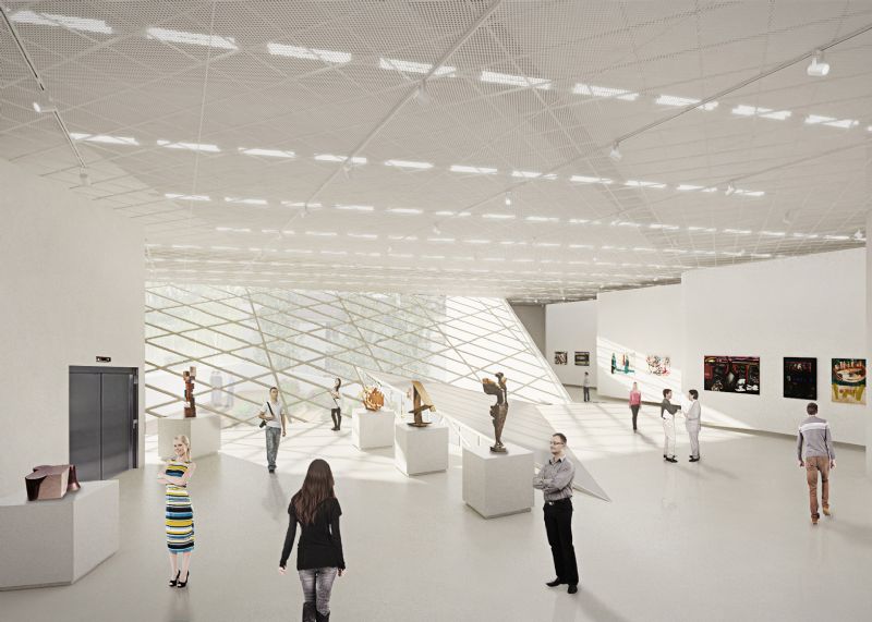 Binnenin leidt de inkomhal met hoge plafond naar een ruime lobby, die toegang biedt tot 1000 vierkante meter tentoonstellingsruimte met een open plattegrond. Een café, boekenwinkel, educatieve faciliteiten en een auditorium vinden ook hun plaats in het gebouw, naast opslagruimte en kantoren.