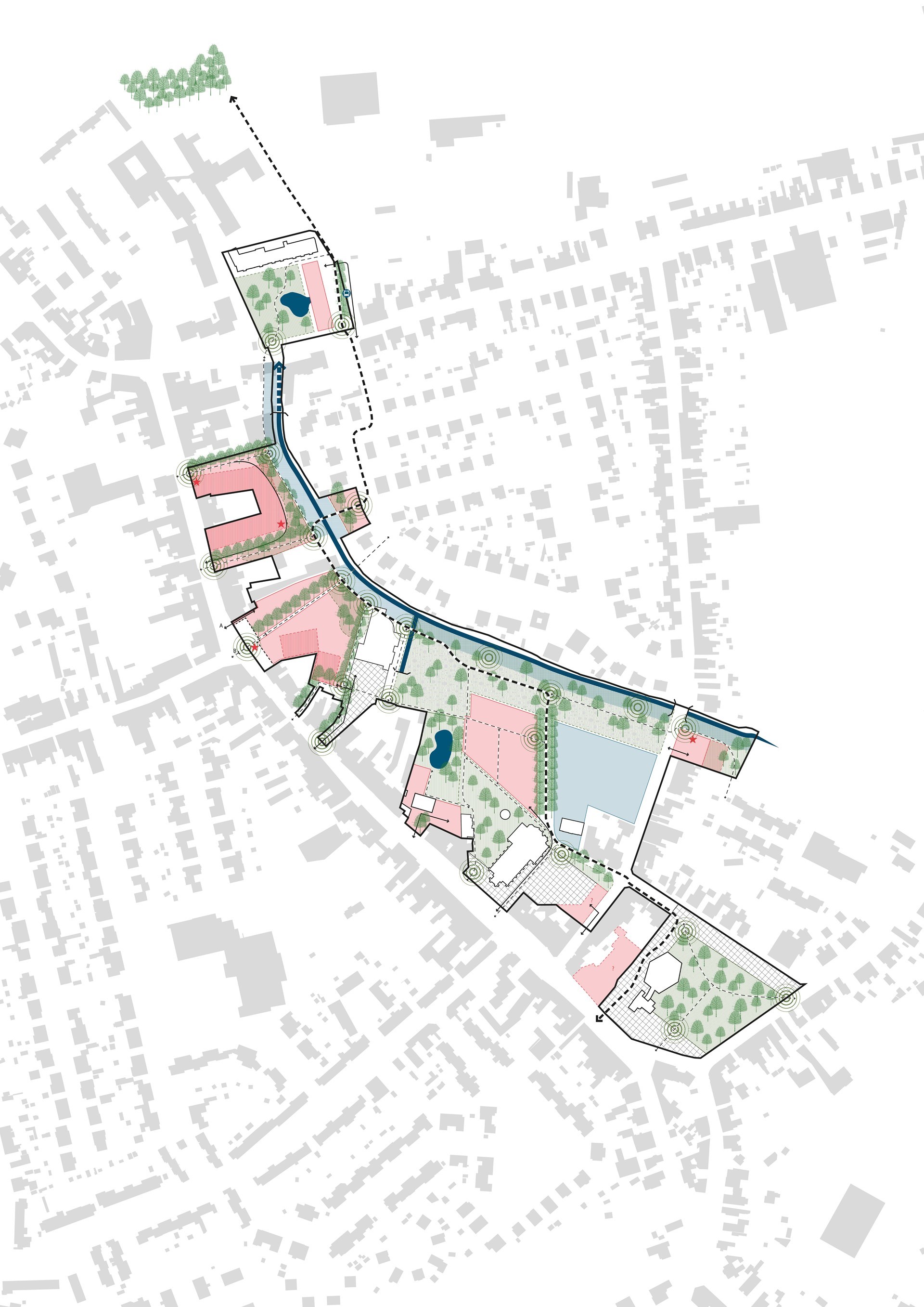 “Onze steden en dorpen hebben een erg verouderd woningpatrimonium. Om demografische evoluties te volgen zoals de stijging van de bevolking, een toenemende vergrijzing en gezinsverdunning moeten er de komende jaren in België elk jaar 30.000 extra wooneenheden bijkomen. Om een antwoord te bieden op de nood aan kwalitatieve woningen, zullen we eerder moeten kijken naar het reorganiseren van het bestaande patrimonium en het voorzien in alternatieve woonvormen, in plaats van ze allemaal nieuw te gaan bouwen. We moeten daarbij op zoek gaan naar kwaliteitsvolle en toekomstbestendige architectuur op maat en op schaal van het dorp.” Dat schrijven Eva Heuts (VIBE) en Erik Grietens (Bond Beter Leefmilieu) in het zopas gepubliceerde voorbeeldenboek 'Stedenbouw kan ook zo'. Daarin verzamelen ze zeven voorbeeldprojecten van 'De aanpasbare stad'. Het masterplan voor een groenblauwe woonas langs de Blokstraatbeek in Sint-Gillis-Waas, is er één van. Atelier Romain tekende het ontwerp.
