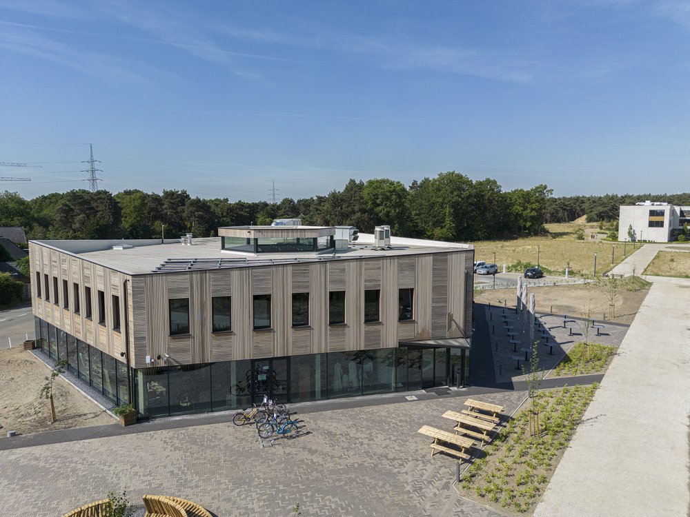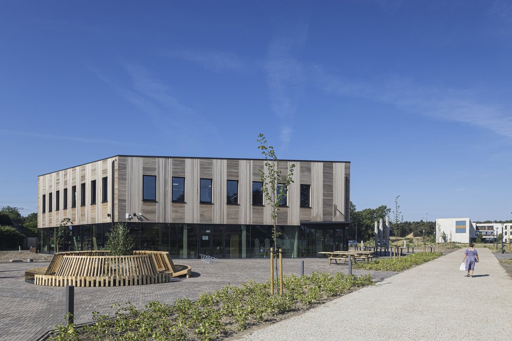 De buitenruimte is integraal deel van het ontwerp. In samenwerking met Biotoop werd een biodivers landschapsplan uitgewerkt met bloemenweides, bomenrijen en een wadi die regenwater buffert. Deze ingrepen creëren een aangename buitenruimte voor bezoekers en medewerkers én versterken de ecologische waarde van de site. Het achterliggende groen van Meysterbergen wordt visueel en ecologisch doorgetrokken tot aan de Stationsstraat.