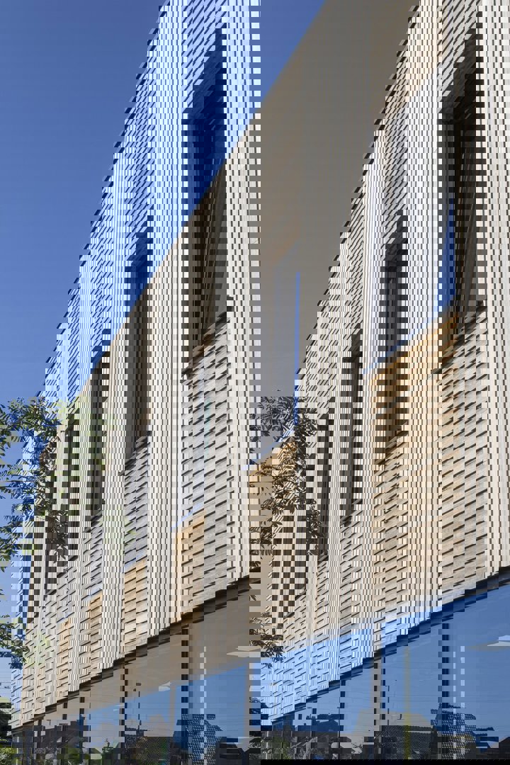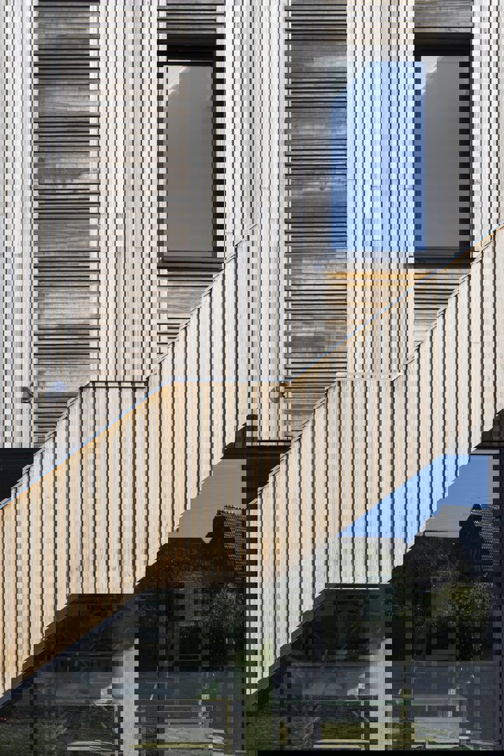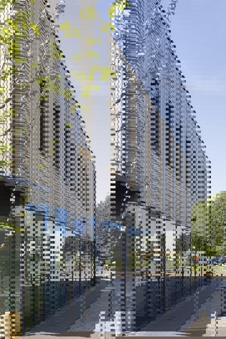 Duurzaamheid was van meet af aan een centrale ontwerpfactor. De dragende structuur is volledig opgebouwd uit CLT (Cross Laminated Timber), een circulair en bio-ecologisch materiaal met sterke ecologische prestaties. Deze houtconstructie staat in voor een CO₂-opslag van 181.199 kilogram – het equivalent van de elektriciteitsconsumptie van 201 huishoudens of de uitstoot van 1,5 miljoen autokilometers. Niet alleen de draagstructuur, ook de afwerking en isolatie zijn volledig bio-ecologisch.