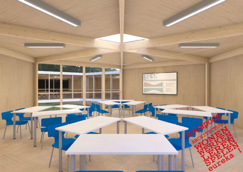 Eureka-architectuur vertaalde het Bouwdoos-concept ook naar de scholenbouw. De klasmodules van het bureau zijn een goed alternatief voor de bestaande containerklassen. Bogaert: “Ze zijn veel duurzamer en comfortabeler en je kan ze gebruiken als een permanente constructie, in tegenstelling tot containerklassen. Die klassieke klasstructuur is, zeker in het basisonderwijs, trouwens voorbijgestreefd. Onze zeshoekige modules kan je op verschillende manieren inrichten en zo verschillende hoekjes maken en makkelijk groepswerk organiseren. Je kan die modules ook aan elkaar koppelen tot een cluster, met een sanitaire module of een polyvalent zaaltje bij. De hele constructie bestaat uit hout, tenzij je een dubbele bouwlaag wil. Dan moet je stalen kolommen integreren.”
