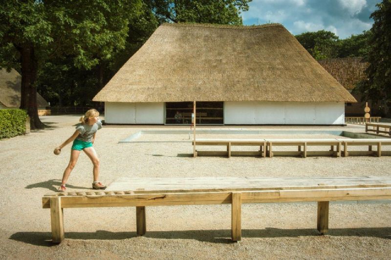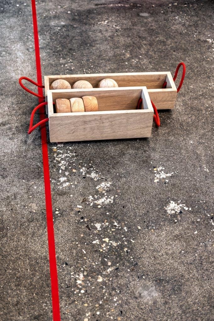 De oude spelelementen uit de volkssportenschuur waren geen collectiestukken en aan vervanging toe. Linde Hermans ontwerpt de nieuwe spelelementen vanuit hun originele werking én spelregels als zeer eenvoudige objecten. Er wordt zo min mogelijk aan ‘vormgeving’ gedaan, de spelen ontstaan uit hun functie, net zoals dat vroeger is gebeurd. De spelen zijn opgebouwd als tafels waarvan de poten langs buiten bevestigd worden. Deze poten passen zich aan in functie van het spel. Soms worden ze hoger, bijvoorbeeld bij het hamertjesspel, of schiet één poot door zoals bij het tafelkegelspel waar dan bal en koord aan worden bevestigd. “De constructiemethode en enkele kleine en subtiele toevoegingen linken de spelen aan elkaar, waardoor de hele look en feel van de schuur een hedendaags karakter krijgt”, stelt ontwerpster Linde Hermans.