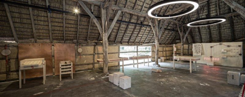Nieuwe daglichtbuizen die geïntegreerd worden in het rieten dak bundelen het zonlicht en realiseren zo samen met de bijkomende gevelopeningen een lichte binnenomgeving. De bijzondere constructie van het authentieke dak krijgt hierdoor meer aandacht. Enkele grote ronde lichtelementen en een lijn met spots bieden aanvullend kunstlicht.