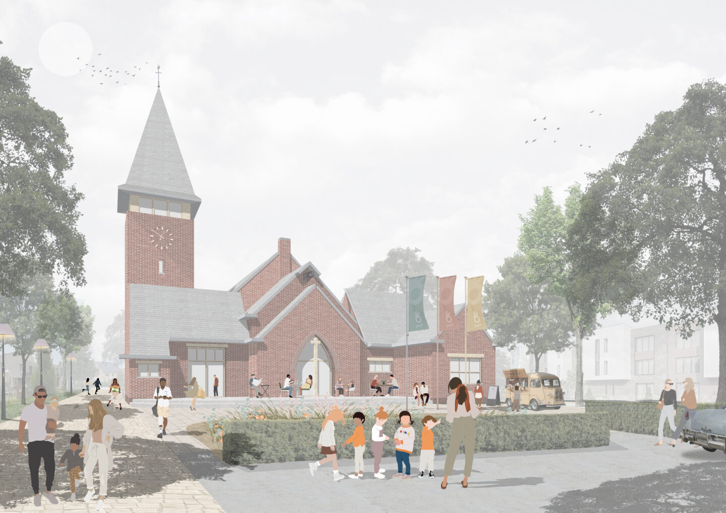 De ambitie is helder: het introverte karakter van de kerk kantelen naar een laagdrempelige, uitnodigende ontmoetingsplek, zonder het gebouw te ontkennen. Het ontwerp vertrekt daarom niet van een “zaal in een kerk”, maar van een nieuwe leesbaarheid van de bestaande volumes en assen, met ingrepen die het dagelijkse gebruik vanzelfsprekend maken. De kerk blijft zo letterlijk en figuurlijk een centraal ankerpunt aan het Regenboogplein, binnen het bredere verhaal van Pelt waarin dorpskernen hun “kloppend hart” heruitvinden.