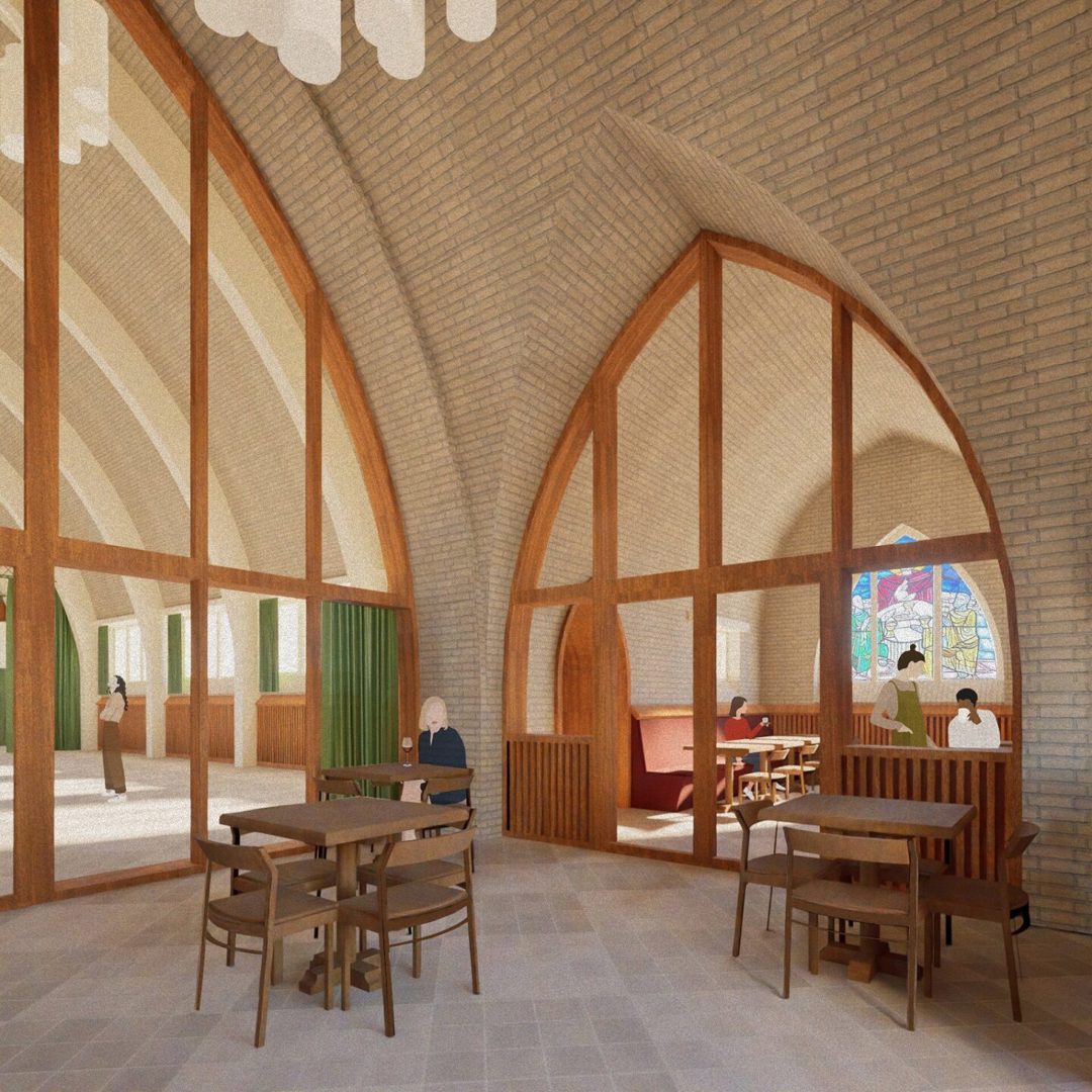 Rond dat nieuwe zwaartepunt worden de zijkapellen doelgericht ingezet: ze nemen de meer besloten functies op, zoals keuken en een vergaderzaaltje. Zo ontstaat een logisch gradueel verloop van publiek naar intiem, zonder het plan te verbrokkelen of extra circulatie uit te vinden. Het dorpshuis werkt tegelijk als overgangsruimte: wie binnenkomt, landt niet meteen in de grote kerkruimte, maar in een herkenbare, menselijke schaal die de rest van het gebouw ontsluit.