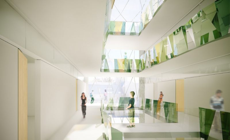 Daarnaast is de looproute in het hart van het nieuwe schoolgebouw verbonden met een ruimte waarin een doorgaande trap alle lagen verbindt. Deze trap voert bezoekers omhoog langs alle verdiepingen met onderweg steeds een ander uitzicht op de omgeving van het gebouw. De flexibele opzet van het onderwijsgebouw maakt het toekomstbestendig, want het is mogelijk om lokalen gemakkelijk om te bouwen voor meer studieplekken.