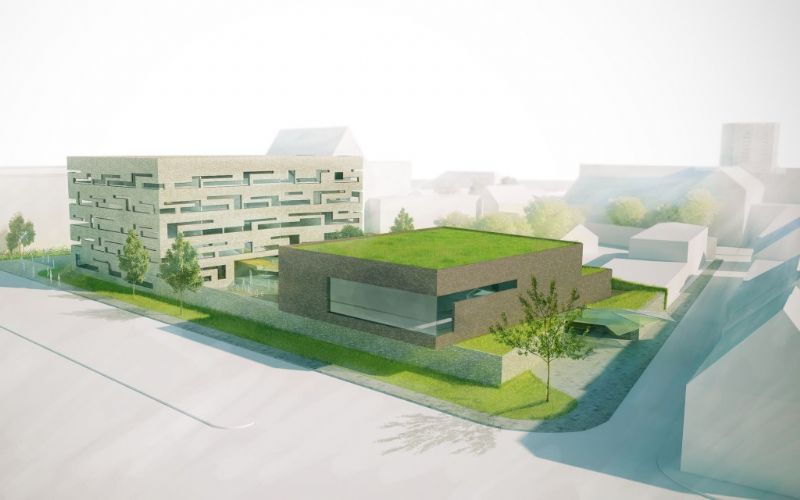 De nieuwbouw omvat twee nieuwe onderwijsgebouwen: een lesgebouw en een sportgebouw. Bovendien worden de bestaande speelpleinen uitgebreid met twee nieuwe pleinen. Een nieuwe, overdekte promenade verbindt de locatie met de binnenstad van Dendermonde. Deze overdekte route verbindt de bestaande en nieuwe gebouwen met elkaar en voert de leerlingen langs de verschillende pleinen. Zo omvat de nieuwbouw in totaal 4.100m².