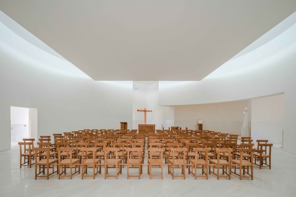 Het gebouw opgetrokken uit wit architectonisch beton, is twaalf meter hoog en heeft twee niveaus. De benedenverdieping omvat een keuken en moduleerbare parochieruimtes gericht op het buurtleven. De gebedsruimte op de eerste verdieping met zijn blinde muren heeft een sobere en verfijnde stijl en biedt plaats aan zo’n 150-tal gelovigen die er in alle rust kunnen bijeenkomen onder een zacht zenitaal licht.
