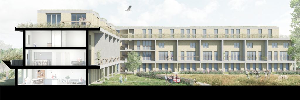Ons project dat voorziet in 34 woningen in een Community Land Trust in de wijk Meulestede in Gent. Los van het onconventionele financiële model waarbij men de grond niet overneemt als eigenaar, is het project zo opgebouwd dat het binnen een onconventionele schakeling – met tal van voordelen - van woningen toch conventioneel wonen toelaat. Het ontwerp is net als ons project voor de Bogerse Velden in Lier een oefening geweest in hoe we met ons project meerwaarde kunnen genereren voor de omgeving. Geen enkele ontwerpbeslissing is hierbij lukraak.