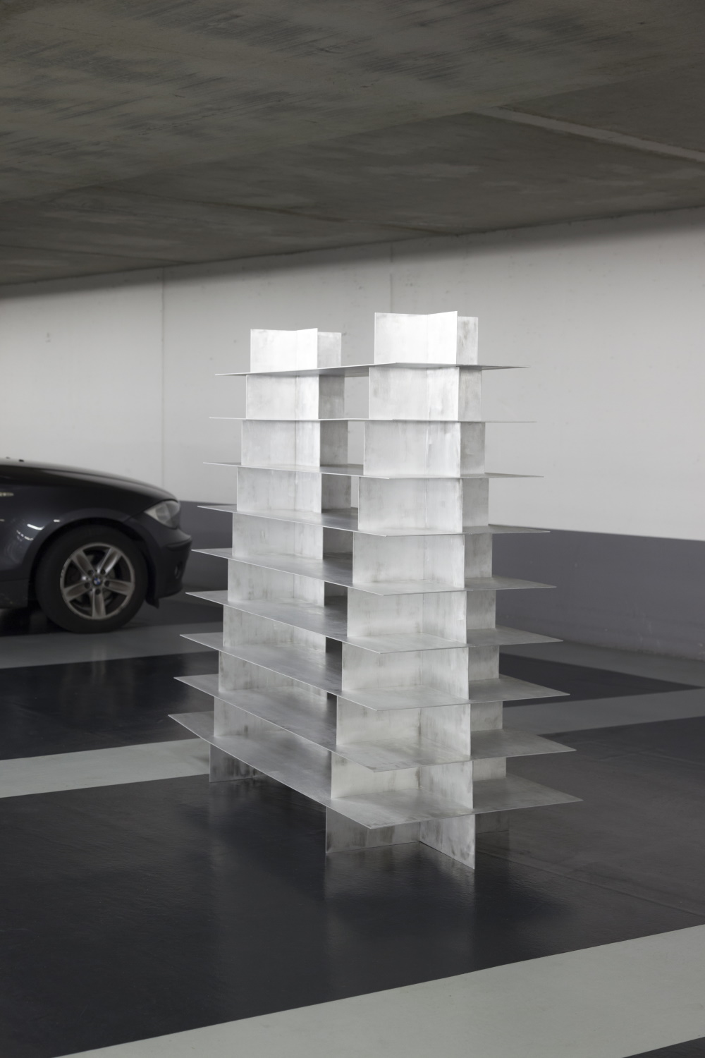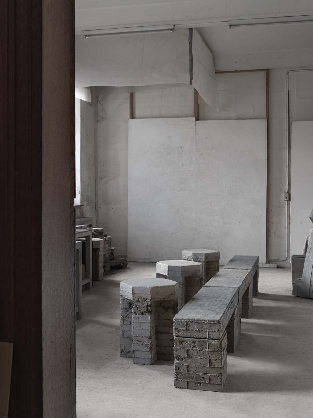 \"Ik werk meestal met industriële, hardere materialen zoals beton, aluminium staal en hout: materialen die ook voorkomen in de architectuur en het stedelijke landschap. Net als in de architectuur ga ik vaak elementen stapelen of zoek ik naar interessante verbindingen in bepaalde materialen.\"