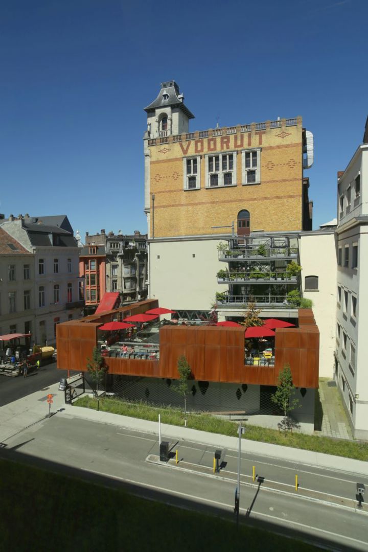 Op het masterplan van Kunstencentrum Vooruit en het masterplan van Muziekcentrum Kortrijk. Kunstencentrum Vooruit, of hoe het in de toekomst ook mag heten, heeft met ons masterplan resoluut de eenentwintigste eeuw ingezet. We hebben aan deze iconische, versteende Gentse kunsttempel 2.200 vierkante meter nieuwe ruimte toegevoegd op, onder en naast het gebouw, met daktuinen, potbomen, hangende tuinen, tuintorens en een semipublieke buitenruimte. En dat in een heel dense stadswijk. De dialoog met het monument heeft onze kennis van ‘weiterbauen’ op een unieke en persoonlijke manier gevoed.
