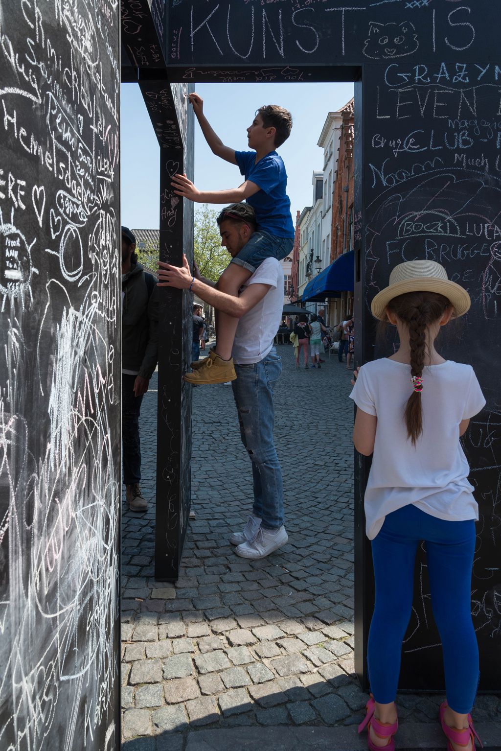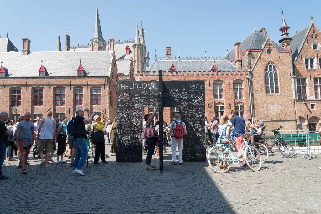 Tijdens de vorige Triënnale in Brugge (2018 – Liquid City) besloot ik om uit eigen initiatief ook een paviljoen te bouwen en in de stad te plaatsen. Ik vond het jammer dat naast de gerenommeerde kunstenaars/architecten, maar weinig (tot geen) lokaal talent werd geëtaleerd, terwijl dit net het moment is om je lokaal talent voor te stellen op internationaal niveau. Na veel omwegen kreeg ik de toestemming en (beperkte) financiële steun om dit project te realiseren. Het werd een verplaatsbaar paviljoen (The Liquid Wall) dat bestond uit twee verticale wanden met een deuropening in het midden die als een kruisvorm in elkaar geschoven waren. De houten wanden werden beschilderd met krijtbordverf die je uitdaagden om een tekening, een boodschap of een idee na te laten. Ik stond niet alleen in voor het ontwerp, maar bouwde ook het paviljoen en verplaatste het in de stad. Op elke nieuwe locatie koppelde ik een activiteit aan dit paviljoen. Ik vond het boeiend om als architect een actieve rol op te nemen en veel meer te zijn dan louter een ontwerper, maar eveneens een bouwer, curator, organisator,… Dat is iets wat ik wil doortrekken naar toekomstige projecten.