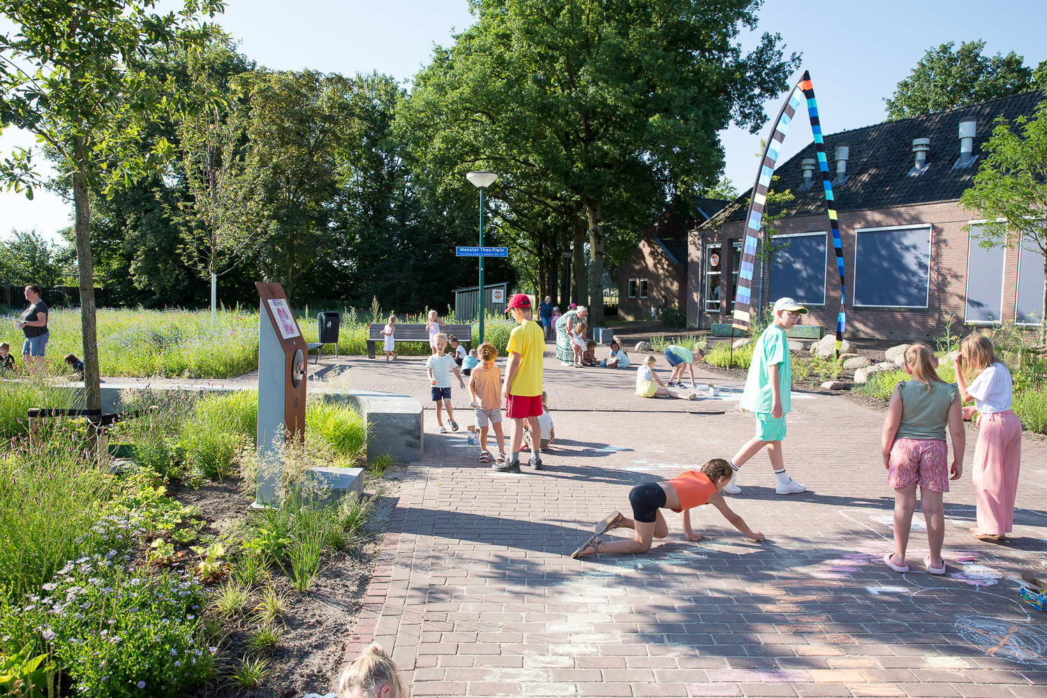 Een tweede project waarop ik echt fier op ben is meer bescheiden van aard, maar heeft voor mij een grote persoonlijke betekenis. Het betreft een klein dorpspleintje in Holthees (NL) gelegen aan de kleine basisschool van het dorpje, het Meester Theo Plein. Het pleintje werd vernoemd naar mijn vader, die zich als directeur van de school met hart en ziel heeft ingezet voor de school en het dorp. Het pleintje was volledig verhard en zorgde voor een verkeersonveilige situatie voor de kinderen van de basisschool. Samen met de school, de gemeente en de dorpsbewoners hebben we een plan ontworpen waarin de ruimte voor de auto tot een minimum wordt beperkt. Een verregaande ontharding zorgt ervoor dat er ruimte voor bomen struiken en planten ontstaat. Aan de zijde van de school zijn een lentetuin en een eetbare tuin voorzien. Een bloemenweide zorgt voor een sterke overgang naar het achterliggende landschap. Vrijwel het volledige ontwerp is uitgevoerd met bestaande materialen die opnieuw gebruikt worden, enkel aan de rand van de weg werd een nieuwe boordsteen geplaatst. Ik ben er vooral fier op dat het gelukt is om dit ontwerp te hebben kunnen realiseren vanuit de verbondenheid van het dorp.