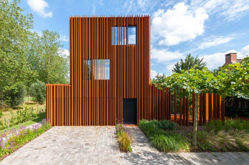 DMOA architecten om hun lef en durf in omgang met nieuwe materialen welke ze combineren en gebruiken op een indrukwekkende wijze. Zo is hun woning met Cortenstaal in Kontich een voorbeeld van een originele integratie van niet alledaagse materialen in een natuurlijke omgeving. Indrukwekkend speels, maar toch harmonieus.
