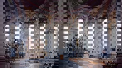 Ik keer graag terug tot het werk van Caruso St John Architects met twee interventies, bescheiden in schaal. Een eerste, die me erg interesseert op vlak van materialiteit, is de interventie aan het koor binnen het barokke interieur van de kathedraal van Sankt Gallen. Hier zat de moeilijkheid om een moderne interventie te verwezenlijken in een dergelijke context.