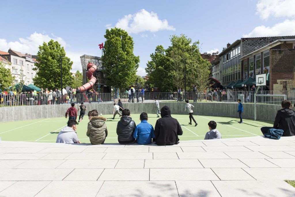 Ten eerste op Bonnevie, een van de projecten met de grootste oppervlakte in het diagram, en dus een bijzonder hoge maatschappelijke relevantie. Bonnevie is een buurthuis met park in het centrum van Sint-Jans-Molenbeek. We wonen zelf in de buurt en zien dat zowel het gebouw als het park op verschillende manieren en tijdstippen zeer intensief gebruikt worden door mensen met verschillende culturele achtergronden en vanuit alle leeftijdsgroepen.
