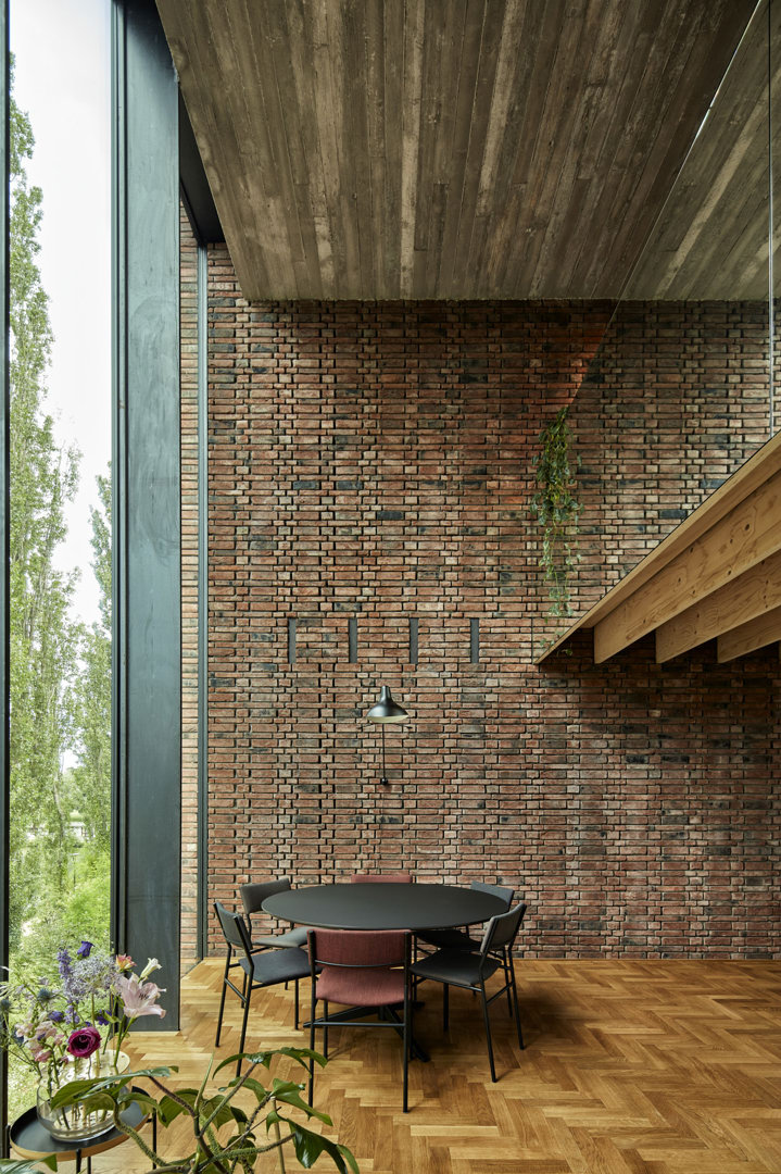 Ten tweede zijn we met ons kantoor erg trots op de realisatie van mijn eigen woning: Bakstenen reus op lemen voeten. Die circulaire private woning met kantoorruimte ligt in een publiek park van 11 hectare aan de rand van het historische stadscentrum van Tienen. De woning vormt een bijna letterlijke, hedendaagse interpretatie van het eeuwenoude gezegde ‘Een reus op lemen voeten’. Dat duidt op een robuust geheel met een fragiele basis. Een statige bakstenen reus van 15 meter hoog is stevig verankerd in het landschap en de vettige Tiense kleibodem, maar wordt in de kern gedragen door een gestampte lemen wand. Die is volgens het eeuwenoude ambacht gebouwd zonder bindmiddelen of kunstmatige verstevigers. De 40 centimeter dikke en 50 meter hoge wand vormt de structurele kern voor het bakstenen omhulsel en is het hart en de blikvanger doorheen de woning. De wand oogt kloek en stevig, maar is in wezen fragiel en kwetsbaar, want met water is hij weer te transformeren tot zijn liquide basisvorm, modder.