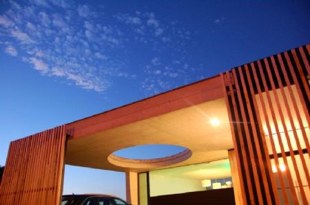 Het eindresultaat is een gekantelde woning, die de helling van het terrein volgt om zo de warmte van de zuidkant te laten migreren naar de leefruimte aan de noordzijde. De carport staat zo hoog mogelijk en het resterende hoogteverschil naar de leefruimte werd opgelost door vijf langzame traptreden en een hellingbaan via de nachthal te plaatsen. Een grote ellipsvormige uitsparing zorgt voor licht en zonnewarmte in de keuken.