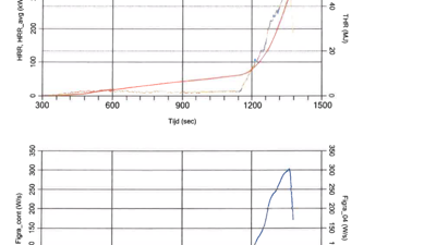 Tot in minuut 19 verkreeg de houthandel een stabiele brandreactieklasse B met sterke brandwaardes als een FIGRA van +- 70W/s (grenswaarde brandreactieklasse B - 120W/s) en een THR600 van 6,33 MJ (grenswaarde brandreactieklasse B 7,5 MJ). Plots ontaarde deze schijnbaar perfecte brandtest in een brandinferno. Deze specifieke opbouw zorgde ervoor dat de verschillende materialen een enorme impact op elkaar hadden en tijdens een enorme, exponentiële groei werd de brandtest abrupt op +-350kW stopgezet.