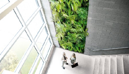 'Wij hebben al vijf jaar ervaring in groene wanden maar sinds vorig jaar hebben wij ons eigen Saint-Gobain gevelsysteem op de markt gebracht. Het is een full-panel systeem, dat wil zeggen dat wij gebruik maken van een paneel, dat je als een tweede huid kan monteren op de gevel. Zo kunnen wij een buitengevel vervangen door onze plantengevel. Het is zelfregulerend. Wij bouwen een wand, uiteraard met plantjes, maar in de wand zit ook een volledig irrigatienetwerk. De wand bedruipt zichzelf, letterlijk en figuurlijk, door druppelleidingen vanuit een centraal systeem. Het werkt door middel van steenwolsubstraat, die de basis vormt voor onze panelen. Waterbeheersing is heel belangrijk in groene wanden en steenwolsubstraat biedt een uitstekende vochtbalans. Bij binnenwanden kan je hierdoor de vochthuishouding heel goed reguleren. Maar ook een buitengevel, waar je te maken krijgt met vorst, kunnen wij zo vorstbestendig maken. Nog een unieke eigenschap is de snelle montage. Een wand zoals u hem hier ziet, bouwen wij normaal in ongeveer 2 uur.'