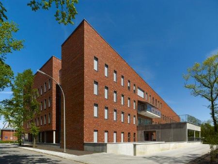 Een blik op de achterkant van De Vierde Wand. De schuin oplopende daklijn, de verticale raampartijen in de gevel en de karakteristieke roodbruine gevelsteen zorgen ervoor dat het nieuwe complex op architecturaal vlak aansluit bij de aanpalende historische bebouwing op de Evence Coppéeplaats.