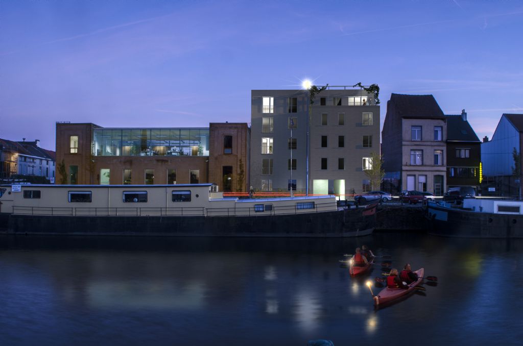 Het wedstrijdontwerp voorziet tien appartementen. In de linkerbeuk vinden worden vijf identieke eenheden (type 2/3) boven elkaar geschakeld, vanuit bouwkundig akoestisch en financieel oogpunt kostenefficiënt. De doorzontypologie schenkt vooraan zichten op het water, achteraan op de binnentuin. In de rechterbeuk vinden we types 1/2 en 3/4.
