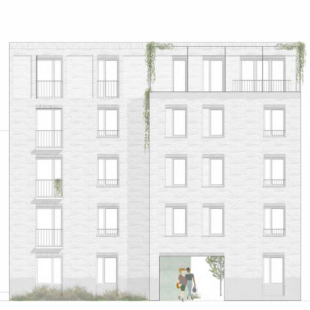 Er werd gekozen voor een architectuur die niet exuberant is, maar zich sober integreert in de omgeving. Mede vanuit financieel perspectief wordt gekozen voor een onderhoudsvriendelijk, stootvast baksteenparament. Een betonplint is interessant om bevuiling tegen te gaan rond de groenzone en knipoogt naar de blauwe steenplinten van nagenoeg alle omliggende gebouwen. DENC!-STUDIO voorziet een aparte groen/grijs genuanceerde steen voor de wanden en vloer van de doorsteek. Hiermee krijgt deze zone een fijn uniek karakter en zal het een aantrekkelijke doorgang worden.