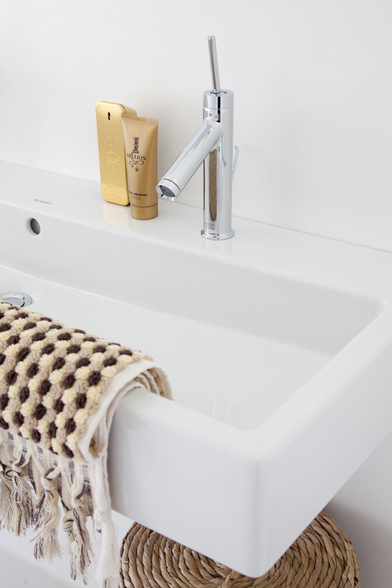 De hoofdbadkamer van het pand werd voorzien van een grote dubbele Vero wastafel en een toilet uit de Starck 3- serie. De ruimte werd optisch vergroot door te kiezen voor de kleur wit. Houten accessoires en rieten manden creëren highlights en onderstrepen de warme sfeer van de ruimte. In de kleinere gastenbadkamer werd dan weer gekozen voor een compacte variant van de Vero wastafel en wederom een wc uit de Starck 3- serie.