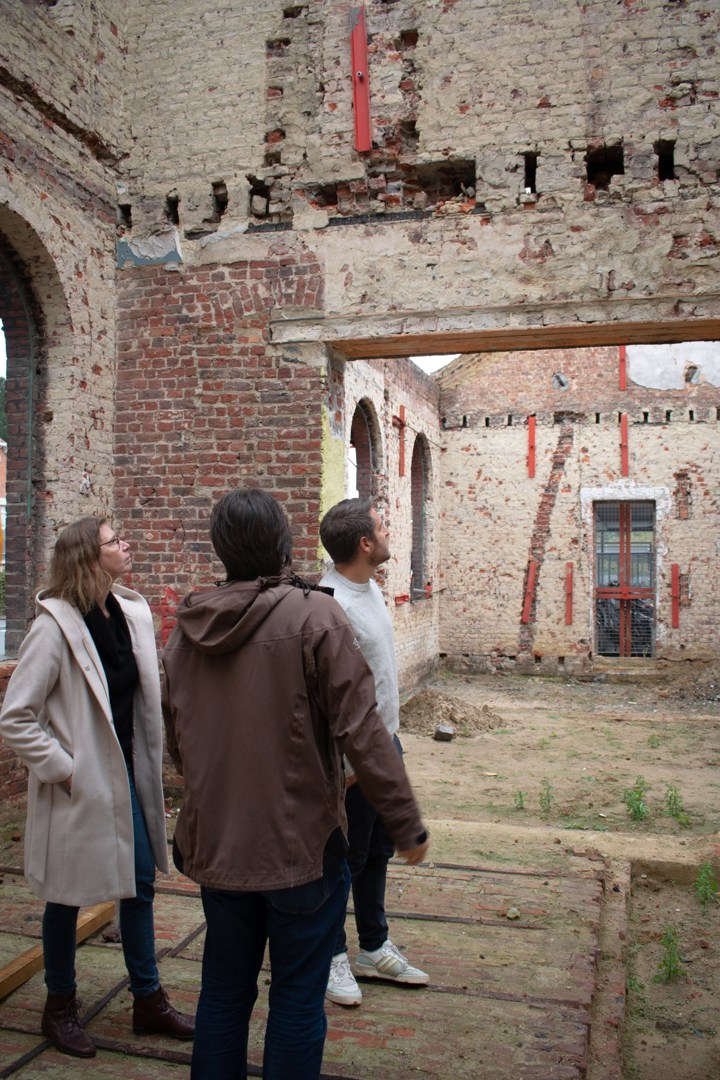 “De enige voorwaarde die ons werd opgelegd, naast enkele eisen rond erfgoed, was dat 50% van het gebouw nog steeds ter beschikking moest staan van de gemeenschap. Daarom voorzagen we in ons plan ook een koffiebar en ontmoetingsruimte. Vervolgens gingen we aankloppen bij archipelago, waarvan de kantoren net als de onze op een boogscheut van het station van Wijgmaal liggen. We besloten de delen die nog rechtstonden te hergebruiken. De delen die ingevallen waren, hebben we verder afgebroken. Daar komt nu een demonteerbare kantoorruimte. Want we wilden, geheel in lijn met onze filosofie, absoluut inzetten op circulair bouwen.”