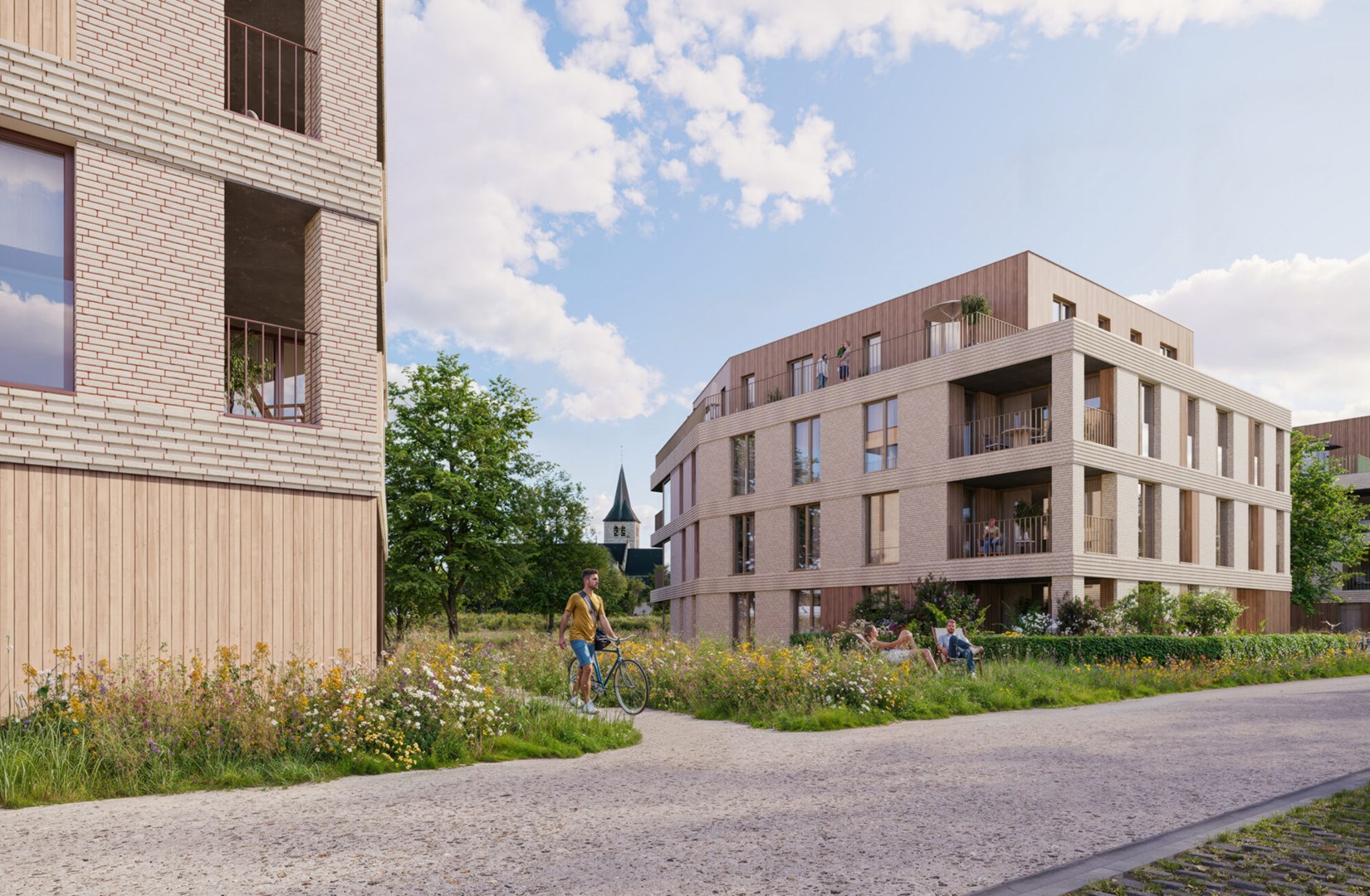 Dankzij de afgeschuinde zijdes van ieder gebouw ontstaat er meer afstand tussen de gebouwen onderling en minder inkijk, maar ook opener zicht naar dorpskern. De penthouses hebben drie gevels en rondom royale terrassen waardoor je daar nog meer kan genieten van een panoramisch zicht. De baksteenarchitectuur van het project, kenmerkend voor de dorpskern, voelt huiselijk en vertrouwd aan, waardoor het project zich inpast in zijn context.