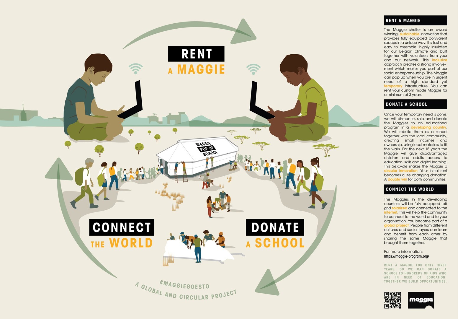 “Wanneer een ander bedrijf containerklassen zou leveren aan Sint-Norbertus, zouden de huurgelden naar het bedrijf gaan. Maggie Program is echter een non-profitonderneming en dus willen we die middelen inzetten voor onze ontwikkelingsprojecten in het zuiden. Dat willen we systematisch gaan doen, vandaar de naam Noord-Zuidconcept. Op die manier worden niet enkel de Maggies, maar ook het geld hergebruikt. Samengevat: we willen een eigen ecosysteem ontwikkelen voor onze vzw Maggie Program waarbij we een project in het zuiden – met dezelfde Maggies – kunnen betalen met huurinkomsten uit een project in het noorden. Moeilijker is het in feite niet.”