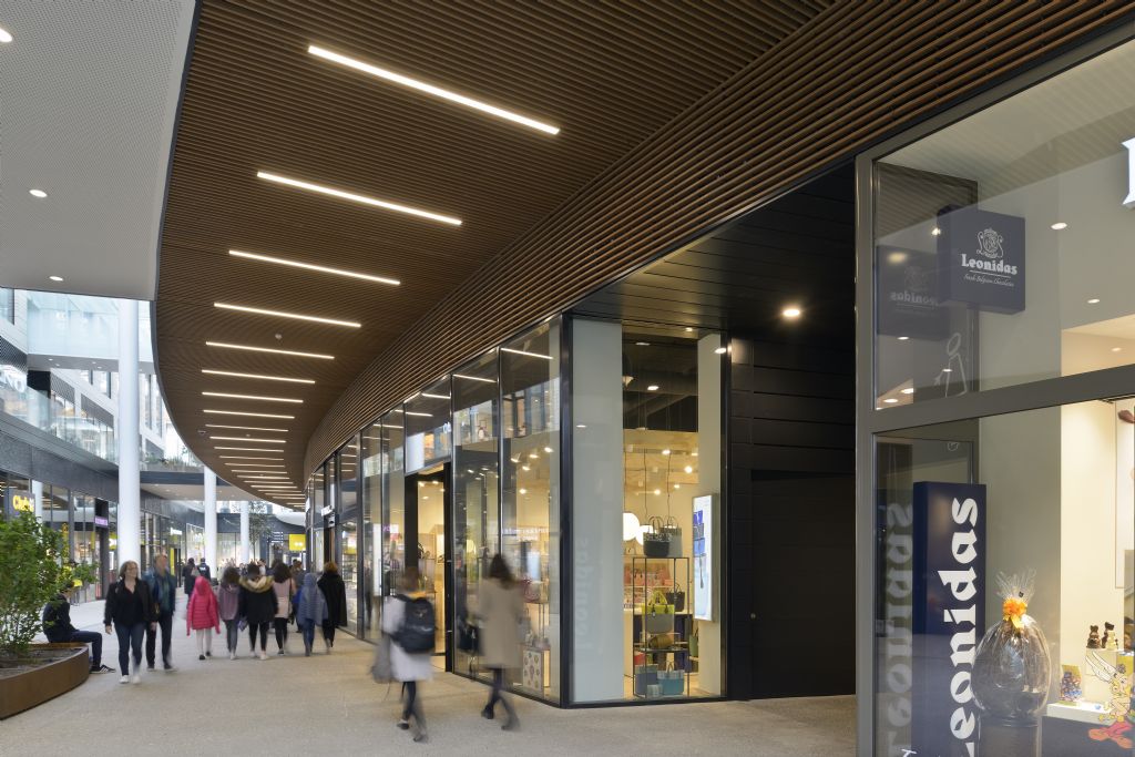 De warme, gezellige en natuurlijke uitstraling van hout vormt een mooi contrast met de eerder industriële look van de andere delen van het winkelcomplex. Omdat de keuze voor hout extra aandacht vraagt voor brandveiligheid, ontwikkelde Hunter Douglas een unieke draagstructuur en brandstabiele samenstelling voor deze innovatieve plafondoplossing. Het Massief Houten Grill plafondsysteem werd succesvol getest door WRFGENT op gebied van brandstabiliteit waarbij het systeem werd blootgesteld aan een temperatuur van 600 à 800 graden.