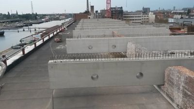 Aan de zijde van het handelsdok kwamen nog twee bouwlagen met appartementen, die 6 meter in uitkraging boven de bestaande kantoren werden gebouwd. Deze uitkraging is gerealiseerd met 12 meter lange voorgespannen prefabbalken van 1,20 meter hoog en 50 centimeter breed. Die werden ’s nachts gemonteerd vanaf de straat, wat noodzakelijk was op een plaats waar overdag bijzonder veel autoverkeer is. De appartementen werden uitgevoerd met ter plaatse gegoten paddestoelvloeren – waarbij enkel kolommen en een vloerplaat voorzien zijn - zodat balken noch muren de flexibiliteit van deze verdiepingen in de weg zouden staan.