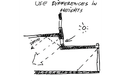 Hoe dichter een raam bij het binnen-plafond staat, hoe meer licht er op kan weerkaatsen om de daglichtprestaties van de onderliggende ruimte te verbeteren.
