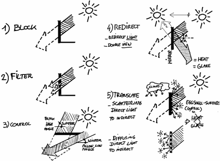 Blokkeren is ideaal om te voorkomen dat er direct licht door je ruit komt om oververhitting te voorkomen; de kunst is om alleen te blokkeren wat je niet wilt op het moment dat je niet wilt dat het doorkomt. Men zou kunnen besluiten om lager licht (’s ochtends en ’s avonds /begin jaar en einde van het jaar) door te laten .