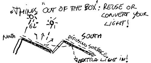 WISTJEDATJE: Een spiegel gebruiken om het directe zonnelicht te heroriënteren naar een plaats waar het afwezig is, is een interessant uitgangspunt. De wet hier is : invalshoek = uitvalshoek. Het is echter niet gemakkelijk omdat de zon beweegt! Let wel op dat je geen verblinding veroorzaakt voor de buren of jezelf. Pas ook op dat je met spiegels niet iets veroorzaakt dat je juist wou vermijden. De zuiderkant van een shed van spiegels voorzien is niet de bedoeling want je gaat oververhitting veroorzaken waar je het wou tegengaan. Spiegels geven namelijk geen warmte af, dus neemt ook geen energie op : de kans op oververhitting blijft dus. Je kunt die oppervlakte wel mat wit maken om het direct licht diffuus te maken en zo via het noorden terug binnen te sturen. Spiegels kunnen worden gebruikt om nieuwe zichten te creëren en te verbeteren.