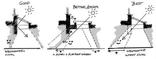 - Licht tegen een zijwand laten weerkaatsen brengt meer licht in de naastliggende ruimte. Dit effect wordt nog vergroot als men eventuele kleine kopmuurtjes weglaat.