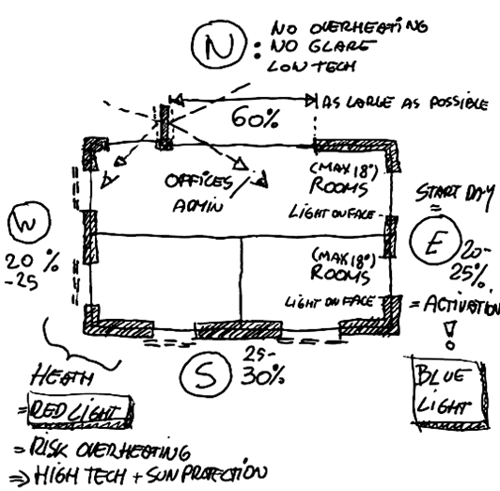 - De Europese Standaard EN17037 zal ook gevolgd kunnen worden naar de zichten toe: met name een opening in elk dakvlak en haalbare zichthoeken. Elke functie heeft ook zijn hoofdstaanplaats en van daaruit moeten de zichten onderzocht worden.
