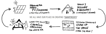 Nu blijft het dak zelf over. De smartroof-gedachte gaat uit van een holistische aanpak waarbij elke potentiële partner in het dak samenwerkt om tot het best mogelijke dak te komen. Alle actoren in een dak (pv-panelen, isolatie, openingen) zijn even belangrijk en hebben allemaal hun plaats.