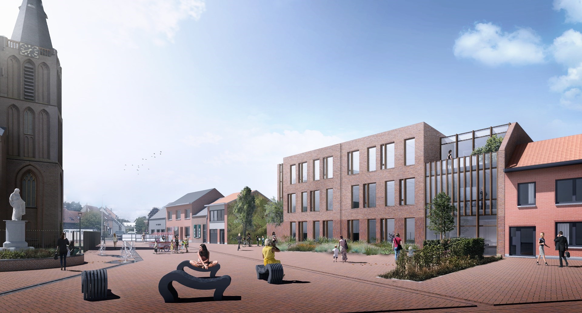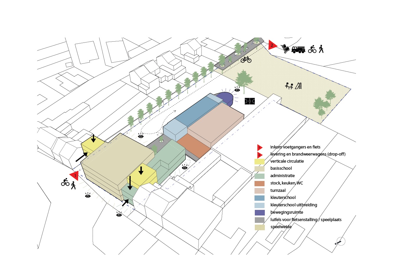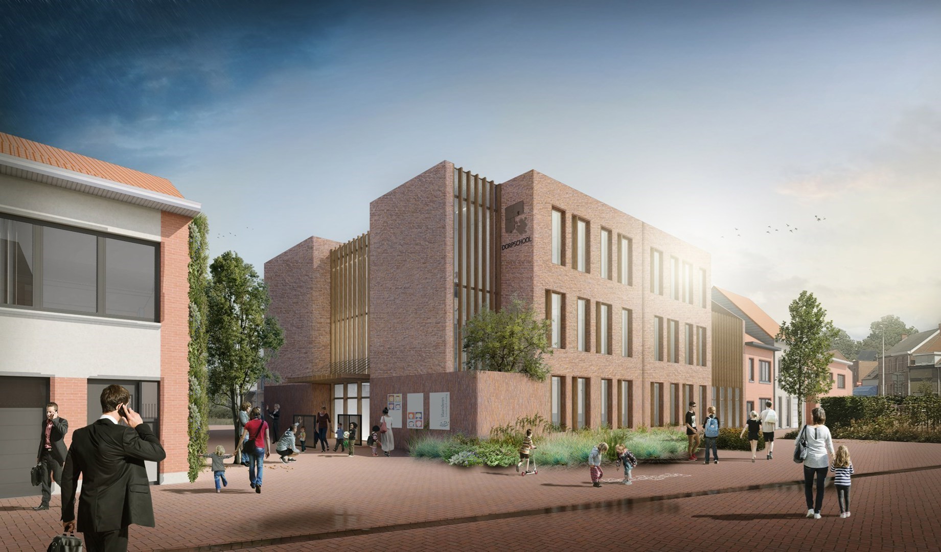 Cuypers en Q architecten benut het bestaande patrimonium in zijn ontwerp, waarvoor het samenwerkte met studiebureaus TECON groep, maximaal en vult het aan met een nieuwbouw die een bestaand gebouw aan de straatkant vervangt. Dat nieuwe hoofdgebouw, met voornamelijk klassen, wordt opgetrokken in roodbruine baksteen. Vliesgevels met houten keperwerk creëren een zachte overgang tussen de nieuwbouw en de lagere bebouwing in de straat. Het beglaasde volume aan de rechterkant van de nieuwbouw – wanneer je naar de nieuwbouw kijkt – vormt de schakel met de bestaande bebouwing rond het plein en bevat verschillende administratieve en overlegruimtes. Het volume maakt tevens de verbinding met de achterliggende bestaande sporthal en met de kleutervleugel, die op zijn beurt een aanbouw krijgt voor een extra kleuterklas en bewegingsruimte. Op de aanbouw komt ook een dakspeelplaats, zodat de kleuters het achterliggende open landschap vanop hoogte kunnen beleven. Achteraan de dreef naast de school zal een begroende luifel ervoor zorgen dat de fietsen droog kunnen worden gestald. Ten slotte wordt de verharding van het plein doorgetrokken naar de school, zodat het plein en de speelplaats in elkaar overvloeien.